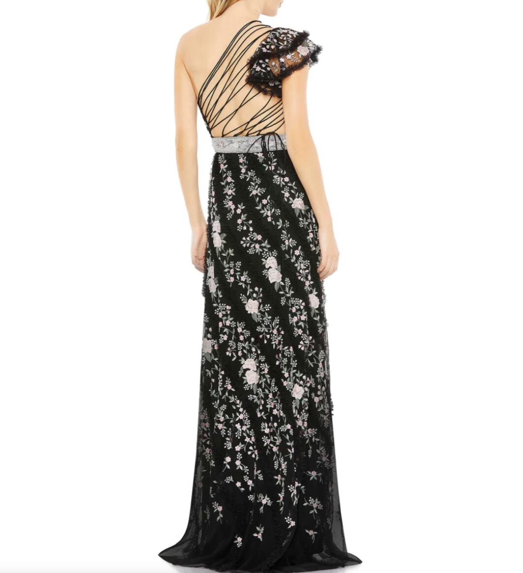 海外お取り寄せ Mac duggal エンブロイダーレースラッフルロングドレス
